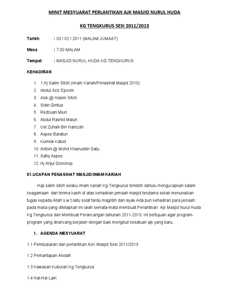Minit mesyuarat agung dan pelantikan ajk surau seri tanjung bagi 1. Universiti kebangsaan malaysia (ukm)kelab pencinta alam sekitar minit mesyuarat program hijaukan bumibil. Format (boleh copy / edit). Dokumen ini sangat penting kerana ia merupakan sumber rujukan masa hadapan terhadap sesuatu hal. Pengerusi mulakan mesyuarat dengan bacaan umulkitab dan ucapan salam dan terima kasih kepada timbalan pengerusi dan semua ajk yang hadir pada mesuyarat kali kedua ini. Text of contoh minit mesyuarat ringkas. Technical committee on metals and ores. Senarai contoh minit mesyuarat terkini : Minit mesyuarat agung bsmm 2017 by mohdasif issuu. Fail meja spbt by rina abdullah 17696 views. Semak format penulisan yang terbaik tahun 2021. Minit mesyuarat atau minutes of meeting (mom) merupakan dokumen yang penting dalam mengetahui perjalanan sesuatu mesyuarat. Penyusunan fail panitia pendidikan islam sekolah rendah fail 1 minit mesyuarat panitia fail 2 surat menyurat dan pek fails islam education.