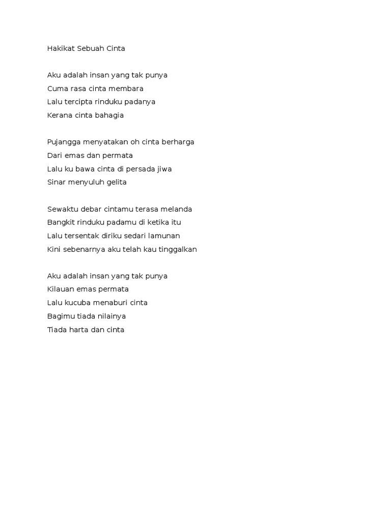 Pujangga menyatakan oh cinta berharga dari emas dan permata lalu ku bawa cinta di persada jiwa sinar menyuluh gelita. Pujangga menyatakan oh cinta berharga dari emas dan permata lalu ku bawa cinta di persada jiwa sinar menyuluh gelita. Sewaktu debar cintamu terasa melanda. Sewaktu debar cintamu terasa melanda bangkit rinduku padamu di ketika itu lalu tersentak diriku sedari lamunan kini sebenarnya aku telah kau tinggalkan. Download lagu mp3 hakikat sebuah cinta iklim gratis.