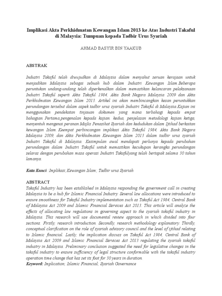 Akta perkhidmatan kewangan islam 2013. Seksyen 30 akta ini memerlukan jawatankuasa syariah ditubuhkan oleh pengendali. Satu persaingan baharu bagi bank. Fsa ditubuhkan di bawah akta lembaga perkhidmatan kewangan 2013. Penguatkuasaan /pematuhan syariah secara menyuluruh. Akta institusi kewangan pembangunan 2002. Perkara 7, jadual 9 : (e) suatu pengendali takaful berlesen di bawah akta perkhidmatan kewangan islam 2013; Implikasi pasca akta perkhidmatan kewangan islam 2013. Berasaskan seksyen 4 akta tatacara kewangan 1957 akta 61, arahan perbendaharaan ini menerangkan tatacara kewangan dan perakaunan yang perlu dipatuhi oleh semua pegawai pengawal atau pegawai yang diberi kuasa (di mana berkaitan) yang bertanggungjawab bagi perkara. Perkhidmatan kewangan islam 2013 akta 759 tetapi tidak termasuk. Kematian peserta, manfaat takaful tidak akan dihibah alma'amun, s., & kamarudin, m. 5 (pekerja perkhidmatan, pekerja kedai dan jurujual).