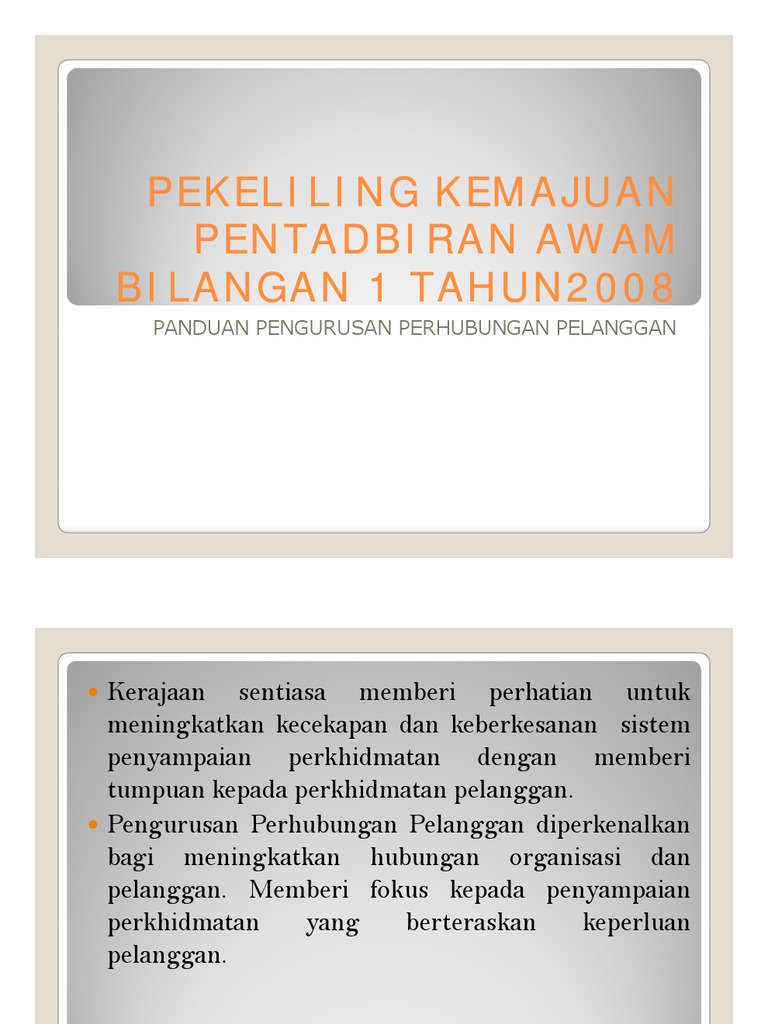 Pengurusan perhubungan pelanggan atau ringkasannya crm (customer relationship management) di. Panduan pengurusan pejabat telah digubal berasaskan ap dan ditambah baik dengan mengambil kira kemajuan bidang teknologi maklumat dan multimedia di samping mengekalkan kaedah pelaksanaan tugas secara tanda nama 30. 5 tahun 2007 (berkuatkuasa mulai 30 april 2007 & menggantikan arahan perkhidmatan 1974). • bahasa malaysia dan inggeris untuk pengurusan pelanggan kemahiran ungkapan bahasa melayu dan bahasa inggeris yang biasa digunakan untuk pengurusan pelanggan dan kaunter. Perhubungan pelanggan perlu diurus secara menyeluruh dan bersepadu sebagai langkah ke arah memenuhi kehendak dan keperluan pelanggan.
