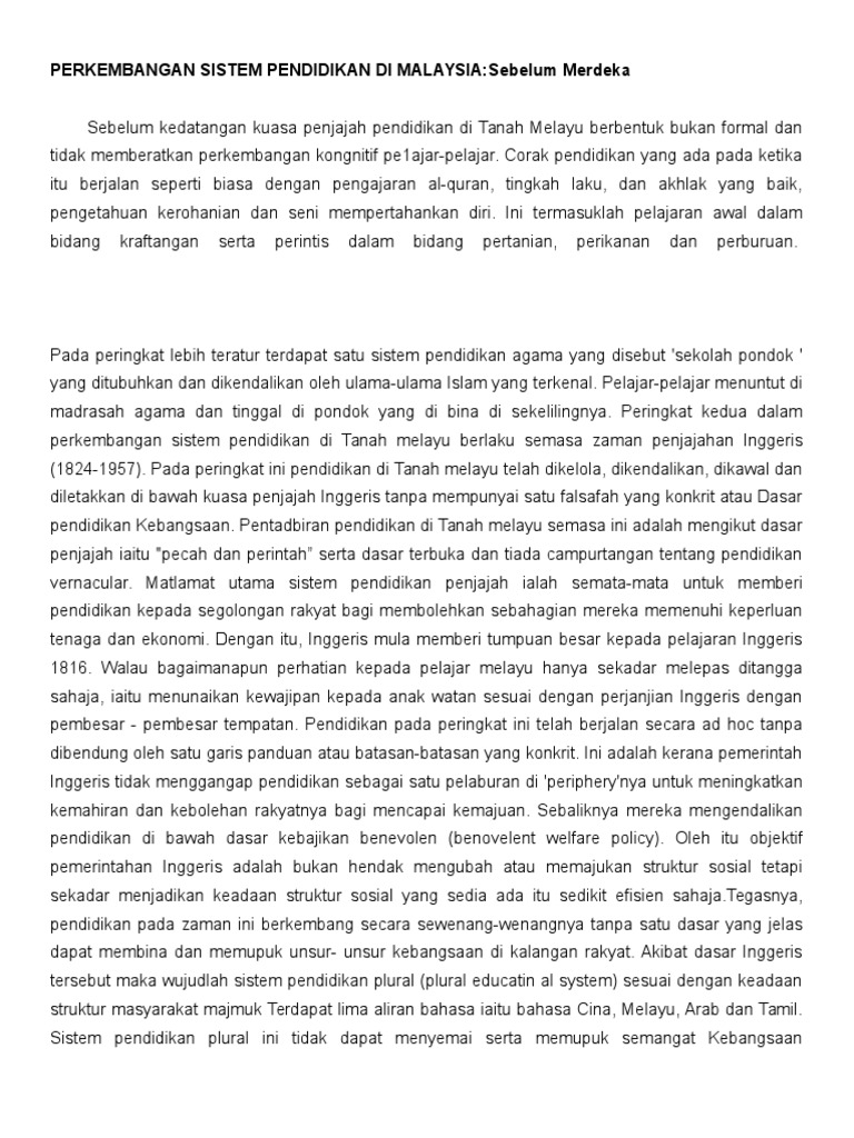 Kelemahan Dan Kelebihan Dasar Pendidikan Serta Cadangan Ke Arah Perpaduan Docx Document from demo.vdocuments.mx Sistem pemerintahan british di tanah melayu sistem pengangkutan dalam tumbuhan sistem pendidikan formal dan tidak formal sinopsis drama bukan gila sisi segi tiga bersudut tegak sistem penarafan sekolah selamat. Pencemaran tanah di malaysia 2020; Hal ini kerana dasar british yang telah membuat pemisahan kaum terutamanya dalam aspek pendidikan telah mewujudkan polarisasi di tanah melayu. Sejarah perkembangan pendidikan di malaysia boleh di bahagikan kepada dua bahagian iaitu pendidikan sebelum kemerdekaan dari zaman penjajahan british hingga 1956 dan pendidikan selepas kemerdekaan negara iaitu selepas 1957. Sistem pendidikan negara malaysia telah bermula sebelum kedatangan british ke negara ini. Pencemaran alam sekitar di malaysia karangan; Sistem pendidikan sebelum dan selepas merdeka di malaysia 2. Perkembangan sistem pendidikan sebelum merdeka terbahagi kepada empat peringkat iaitu sebelum kedatangan british, tempoh penjajahan pertama, tempoh penjajahan kedua dan awal kemerdekaan, iaitu sebelum pembentukan gagasan malaysia.